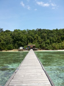 Resor atau penginapan di Pulau Maratua tersendiri di ujung pulau, jauh dari kampung dan penduduk. Alamnya lebih indah dan tempatnya lumayan sepi. Sayangnya, gelombang bersambung-sambung yang disertai angin kencang memaksa kami untuk mengubah tujuan.
