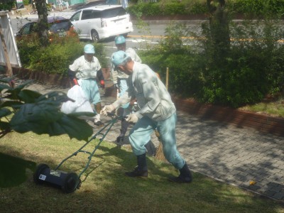 Kami menemui Tatsuji yang saat itu sedang memotong rumput Taman Daisen dengan menggunakan guting rumput. Ada juga yang memakai alat pemotong rumput elektrik yang lumayan berat. Apalagi, alat itu digunakan di permukaan taman yang menanjak dengan kemiringan 20 derajat.