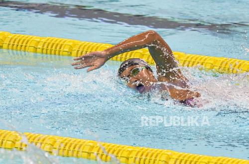 Atlet renang Jawa TImur Ressa Kania Dewi memacu kecepatan saat bertanding pada fina 200 meter individual medley women PON Papua di Arena Akuatik Kampung Harapan, Sentani, Kabupaten Jayapura, Selasa (12/10). Perenang Jawa TImur Ressa Kania Dewi berhasil meraih emas dengan catatan waktu 2.17,95 disusul perenang Riau Azzahra Permatahani meraih medali perak dengan catatan waktu 2.20,31 dan perenang Jawa Timur Patrisia Yosita Hapsari meraih medali perunggu dengan catatan waktu 2.23,97.Republika/Thoudy Badai